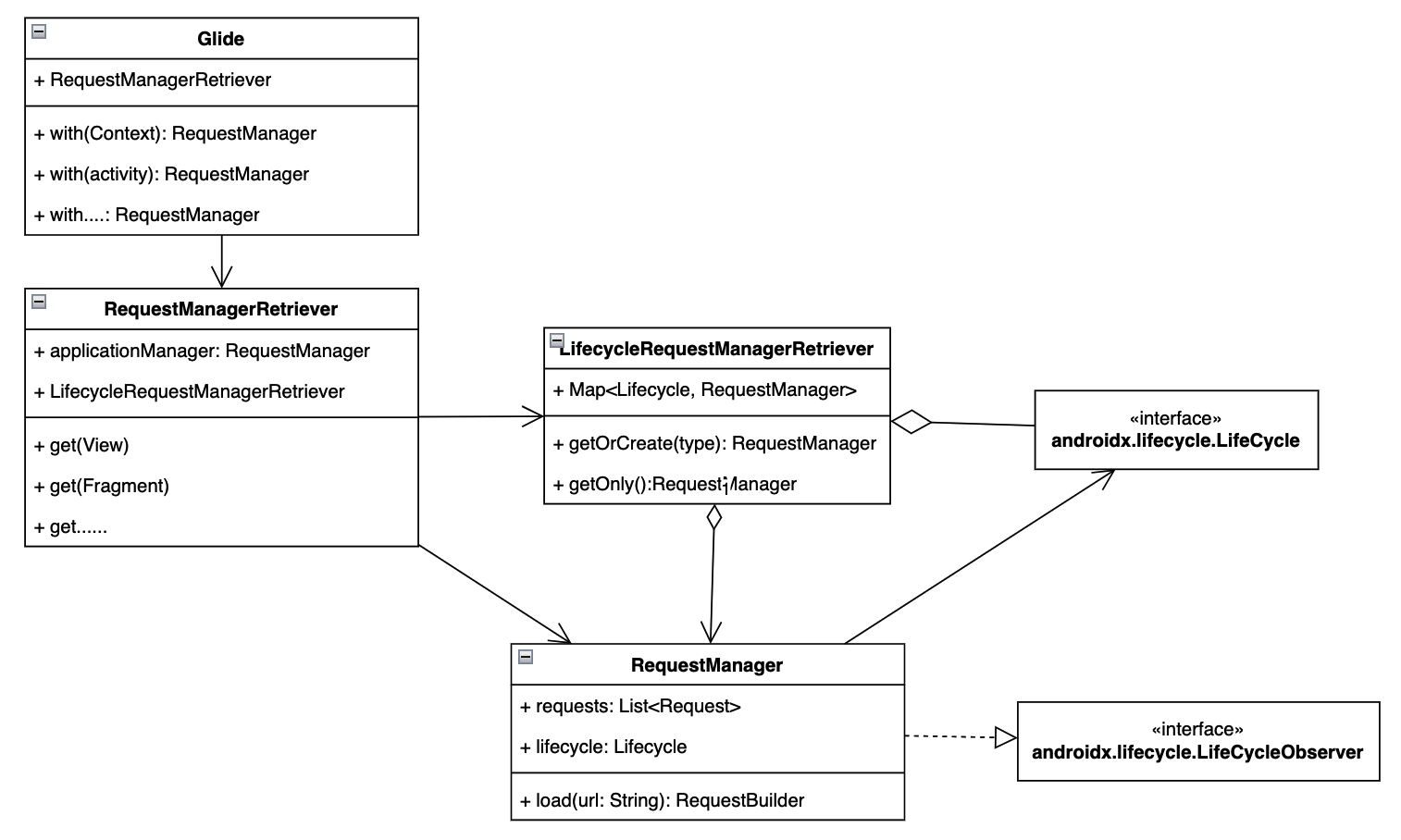 - RequestManagerRetriver:整体负责管理根据 Lifecycle 构建 RequestManager。对于没有 Lifecycle 的 Application的情况自己处理,对于有 Lifecycle 的 Activity 和 Fragment 的情况,则委派给 LifecycleRequestManagerRetriever 处理。